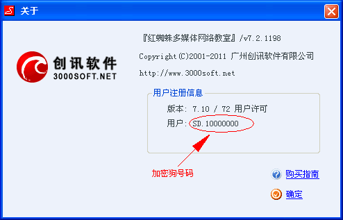 在教師機(jī)上,打開《紅蜘蛛軟件》的教師機(jī)端程序,在主窗口上,進(jìn)入「功能菜單」按鈕下的「關(guān)于」菜單項打開的窗口,就可以查看到加密狗號碼。如下面的圖示:
