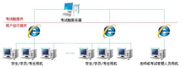 考試酷系統屬于純B/S架構,無需安裝任何客戶端,學生用戶通過瀏覽器登錄系統,參加考試、完成作業或練習、查看參考答案和試題解析、查看考試成績等;教師用戶通過瀏覽器登錄系統,進行學生管理、班級管理、完成試卷錄入/導入/上傳、組織班級統一考試、集中處理閱卷和成績管理等。