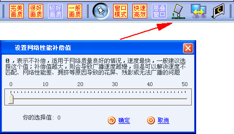 對于這種原因,軟件提供了一種解決辦法。請看左圖,在啟動“教師演示”或“學生示范”狀態下,在屏幕右上角顯示的懸停工具條上,直接點擊“設置演示或示范電腦上的網絡性能補償值”這個按鈕(圖中箭頭所指),打開的“設置網絡性能補償值”窗口中,可以將網絡性能補償值設置為0~50中的某個值,這樣的話,就可以達到速度匹配的目的,但屏幕畫面廣播的速度將因此而降低。這個網絡性能補償值越大,則意味著補償越多,越能使得教師機和學生機的速度得到匹配。一般來說,需要通過實際測試得到一個最佳匹配速度的補償值。