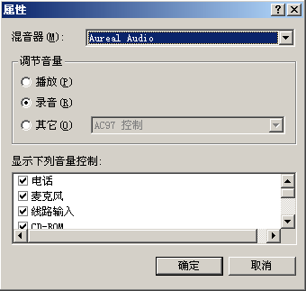 在對(duì)話框的菜單中,選擇“選項(xiàng)-->屬性”會(huì)彈出如圖所示的窗口,確定“混音器”列表選中的正是您所使用的聲卡,再將“調(diào)節(jié)音量”選擇為“錄音”,然后將“顯示下列音量控制”的列表框中的選項(xiàng)全部選中,其中確!胞溈孙L(fēng)”和“立體聲混音”被選中,最后點(diǎn)擊“確定”,回到“錄音控制”對(duì)話框中。